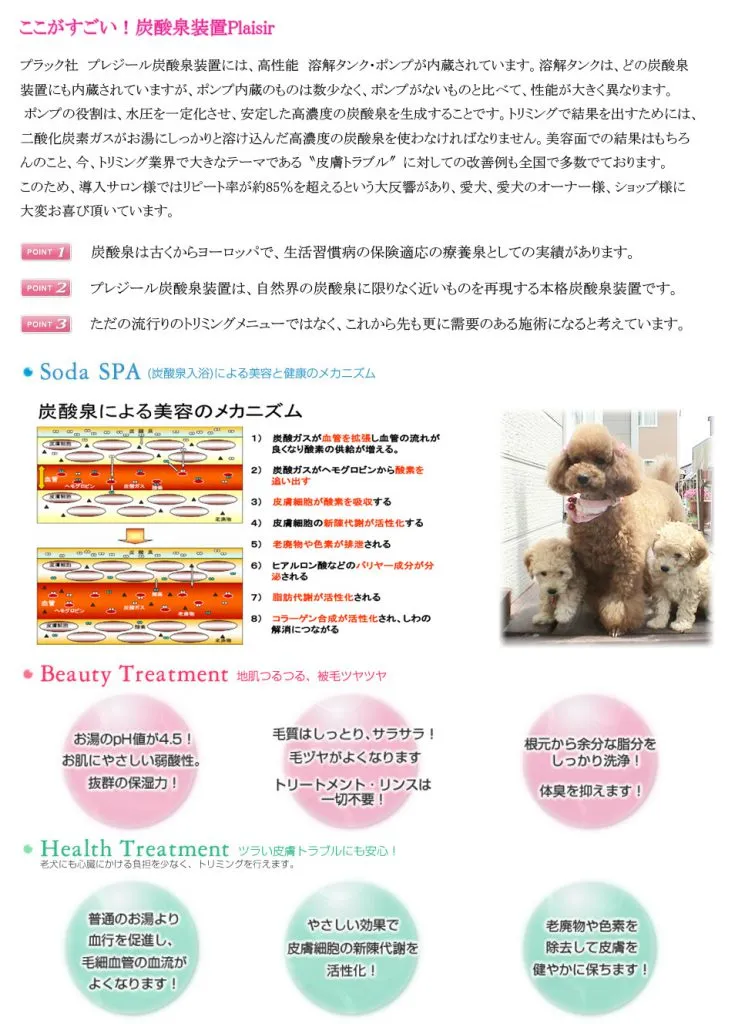 炭酸泉は、濃度が高ければ高いほどその効果を発揮すると言われています。また、明確な作用があることが医学的にも証明されており、動物さんはもちろん人間の病院など各方面において広く活用されています。 当院では、今まで【グルーミングタブ】(重炭酸イオン・炭酸ガス・クエン酸の3つの効果)を使用し炭酸ケアを行っておりましたが、効能が医学的にも証明されている高濃度炭酸泉発生装置を導入し、美容・健康の両面から動物さんたちのトリミング効果がパワーアップできるようになりました。